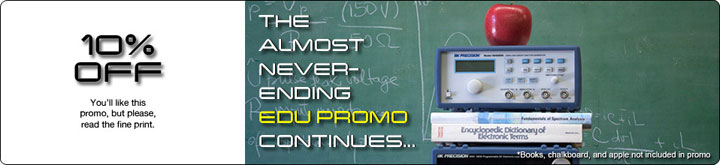 The promotional discount is valid on purchases of almost any current model* and of any desired quantity so long as the minimum purchase amount of $5,000 has been satisfied. The purchase totals and discount will be based on the current B&K Precision list price. Accessories including probes, test leads, interface cables, and refurbished equipment, extended warranties, and calibration are not eligible to receive this promotional discount. B&K Precision reserves the right to modify or discontinue this offering at any time during the promotional period without notice. This educational promotion supersedes any prior promotions and cannot be combined with any other B&K Precision offer, program, or discount. B&K Precision preapproval is required.